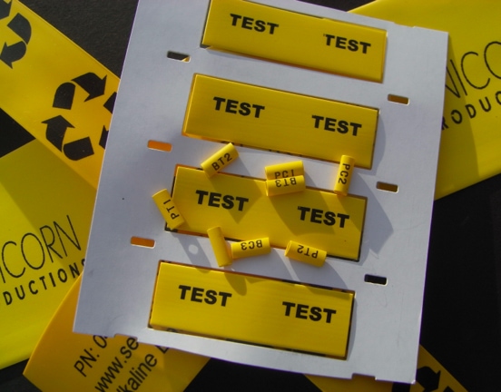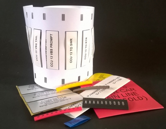 We offer bespoke printed identification, branding and labelling products for quick and easy application. These user-friendly markers can be applied during the manufacturing process or retrofitted and will survive in most environments and where required can withstand extreme temperatures, humidity and exposure to fuels and chemicals. Once contacted, our extremely experienced printing team will happily guide you through the whole experience so that the final product suits your specific application in terms of product suitability and quality. This will involve advising on the correctly sized sleeving, labels or markers which meet required approvals if required, as well as most suitable print process, artwork preparation and resizing via our free artwork service, and producing sample runs as required. We are happy to assist with small or large requirements as well as Call Off Orders and will always ensure deadlines are met. Where there is an urgent requirement, we will endeavour to offer the necessary fast turnaround. Our markers have been used all over the world in a range of industries such as: Automotive, Military, Aerospace, Electronics, Domestic Appliances and many more. We have particular expertise in supplying audio and TV & Film industries. Alongside our two main print processes – hot foil stamping and thermal transfer, we offer a comprehensive cutting service. We also work closely with partners expert in other print methods. This allow us to confidently advise on virtually any printed sleeve, marker or label requirement so if your particular need is not catered for on the website, please don’t hesitate to contact us directly.
